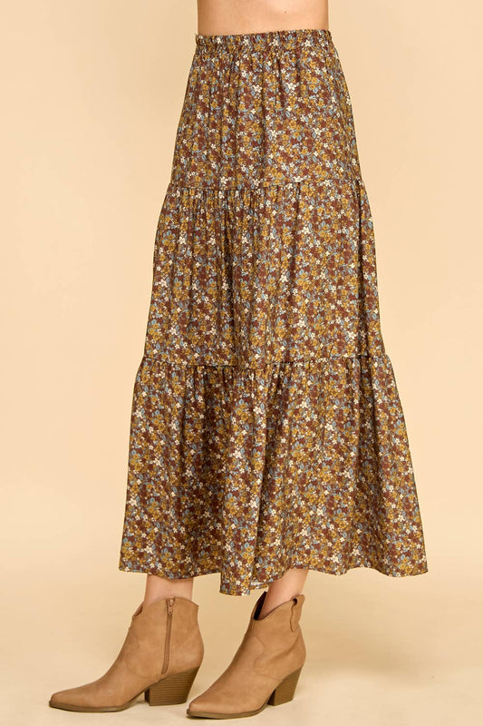 The Boho Side Of Me Brown Floral Tiered Maxi Skirt