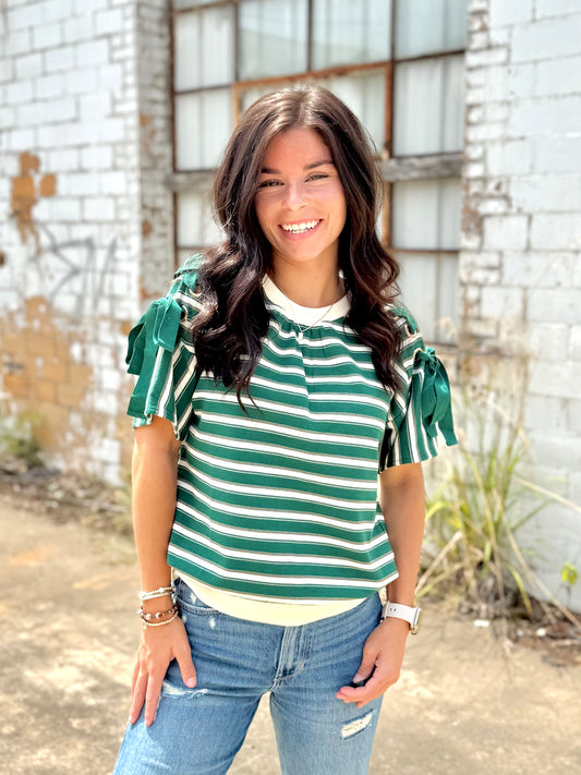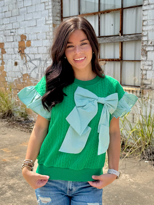 Double Take Stripe Capped Ruffle Sleeve And Bow Cable Knit Top