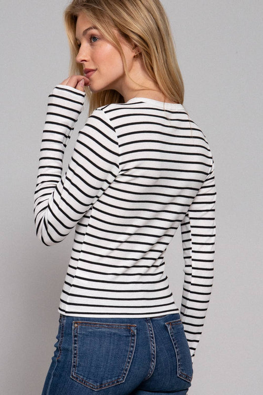 Take me Home Long Sleeve Crew Neck Stripe Knit Top - white/black