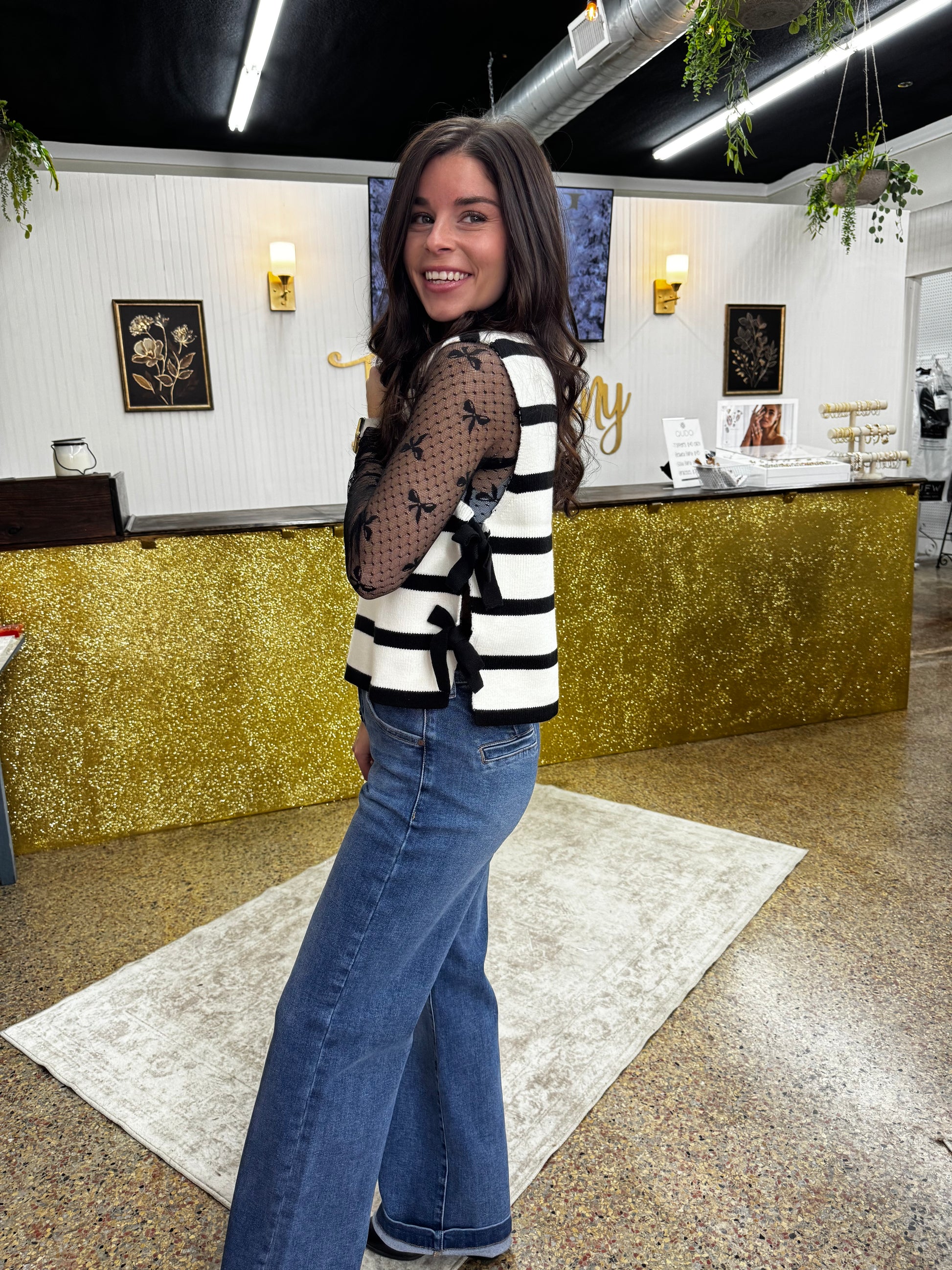 Layer this timeless sweater vest over your favorite tee or blouse for effortless sophistication. The classic ivory and black stripe pattern pairs with a flattering side tie detail that cinches your silhouette beautifully. Crafted for versatility, it transitions seamlessly from casual weekends to polished office looks. The lightweight knit keeps you comfortable while adding dimension to any outfit. A wardrobe essential that works as hard as you do.